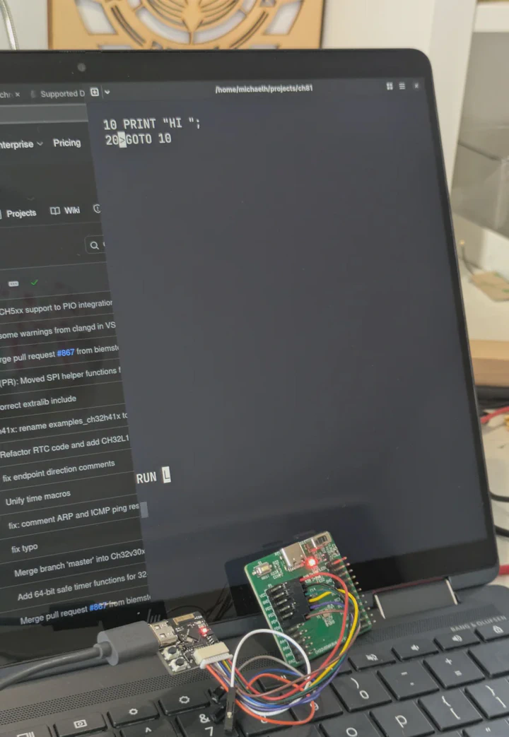 The emulation gets 4 KiB of the CH32V006’s 8 KiB of RAM which is a good step up from the original’s 1 KiB. This could be extended 6 KiB+ by reworking how address decode is done.